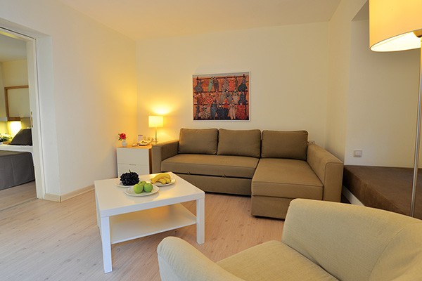 Площадь · 42м2 · Душ · Туалет · Фен · ТВ · Центральное кондиционирование · Сейф · Мини Бар · Балкон или Терраса · Вид на Сад · В одной из комнат - диван и кресло.