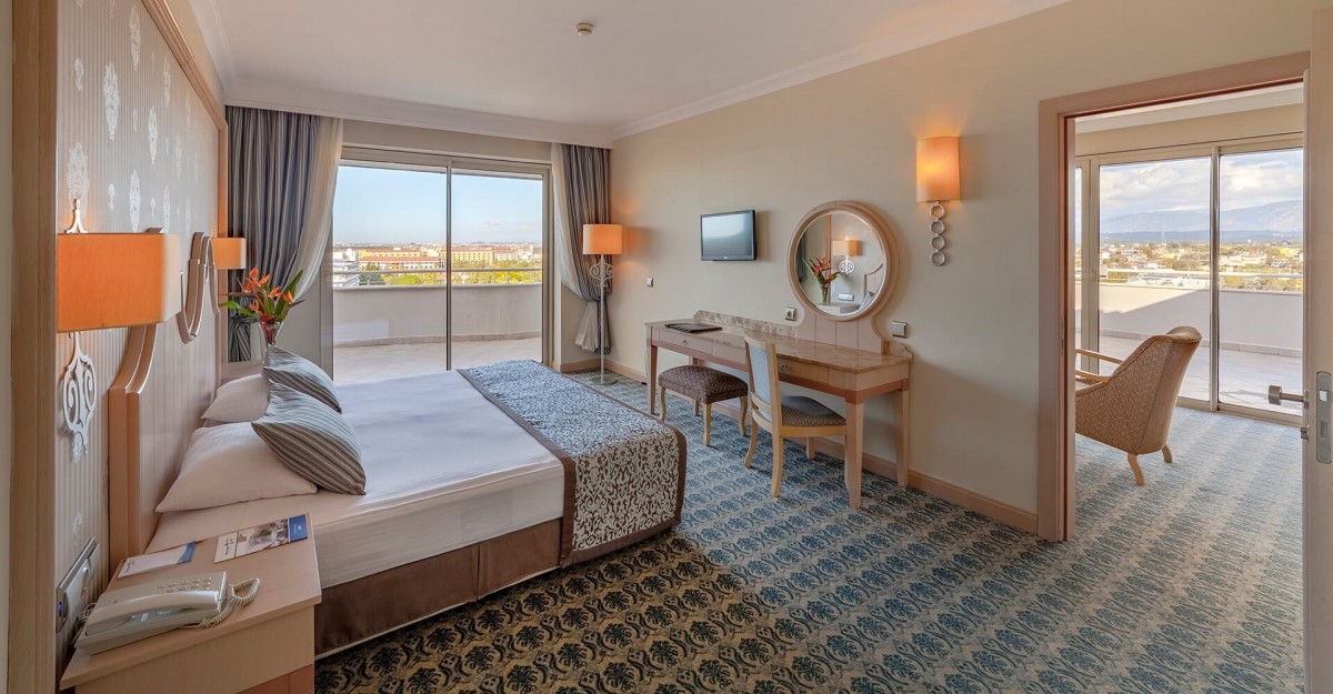 Площадь · 118м2 · с видом на горы/ на море · В номере с дверью между внутренними помещениями находятся одна спальная комната и одна гостиная комната · Одно двухместное и два одноместных кресла · Мини-бар · Ковровое покрытие · Стол для макияжа · Терраса · джакузи · шезлонг · Две ванные комнаты с ванной и душем. · Тапочки · Фен · Телефон · плазменный телевизор со спутниковым вещанием · Центральный кондиционер · Сейф · Бесплатный WiFi интернет